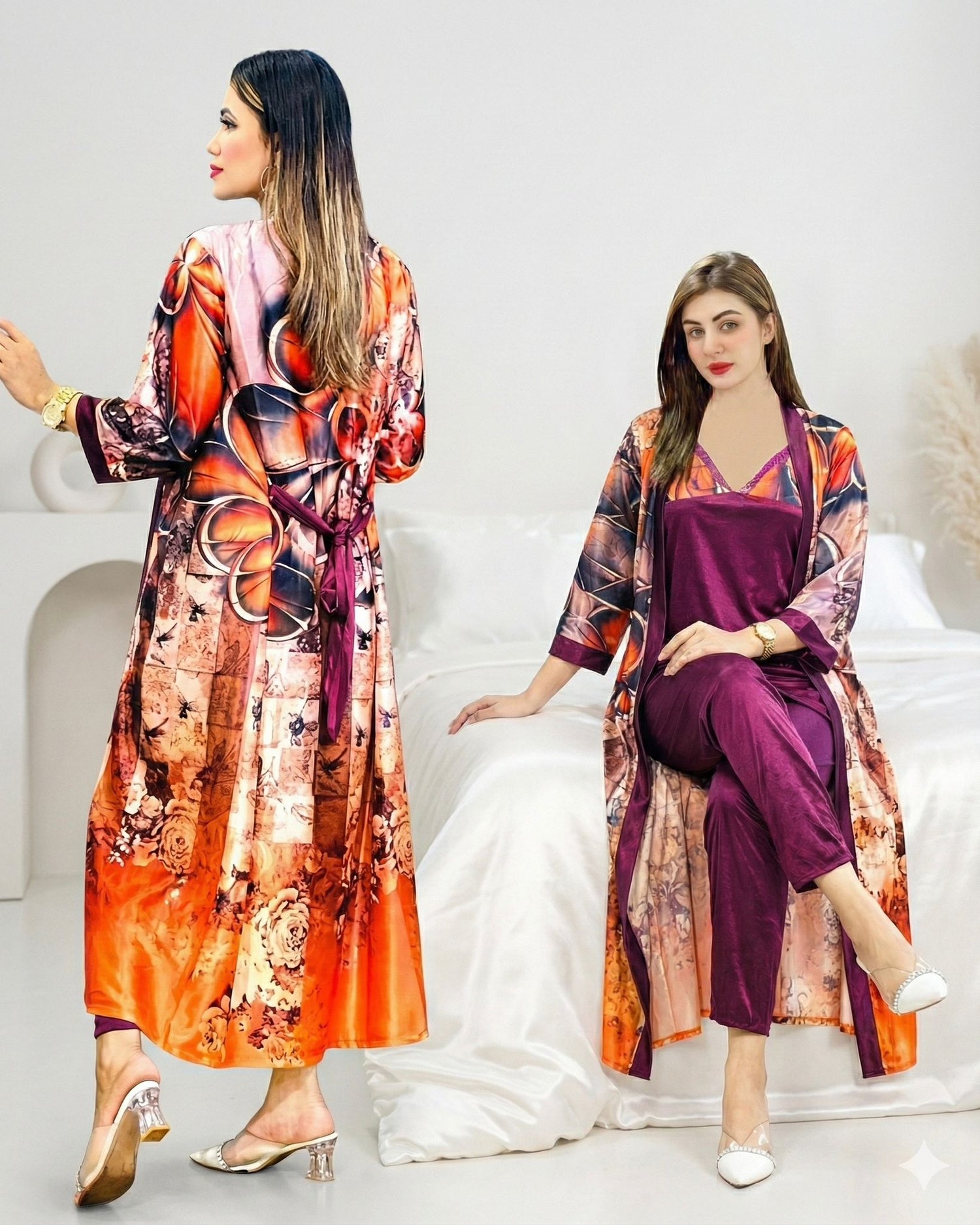 Cross Belt 2 Part Satin Nightwear – Luxury Women Maxi Nighty (Free Size)