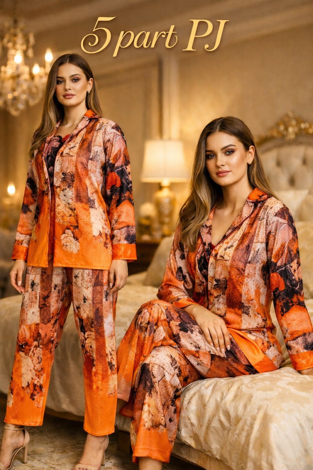 Orange Abstract Digital Print 5 Piece PJ Set – Women Premium Sleepwear XL XXL